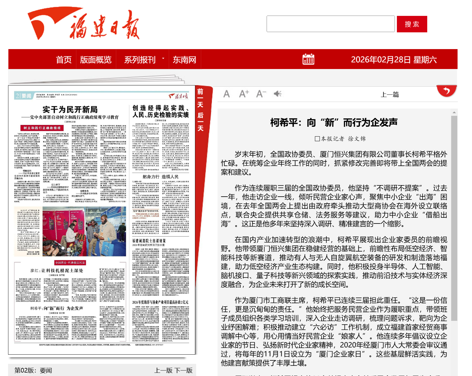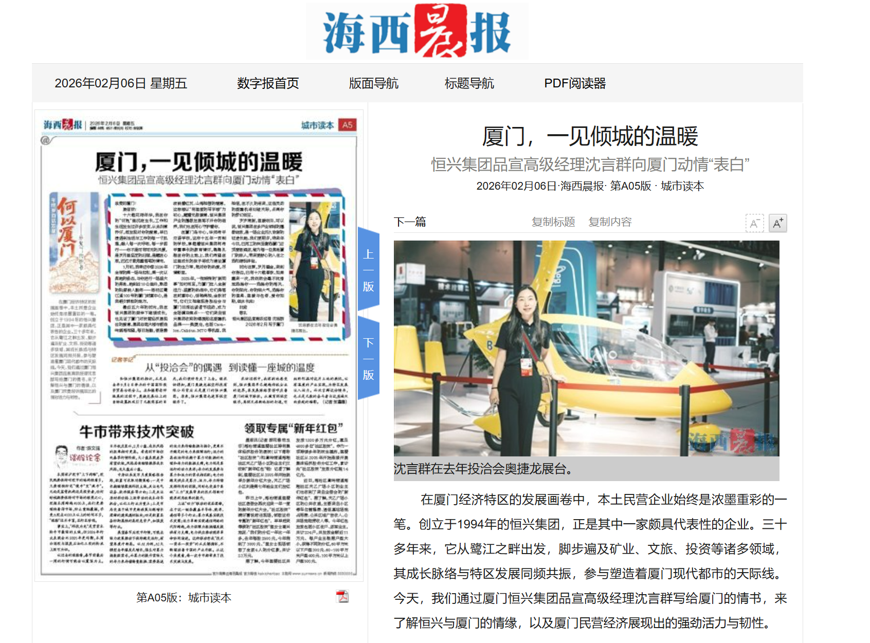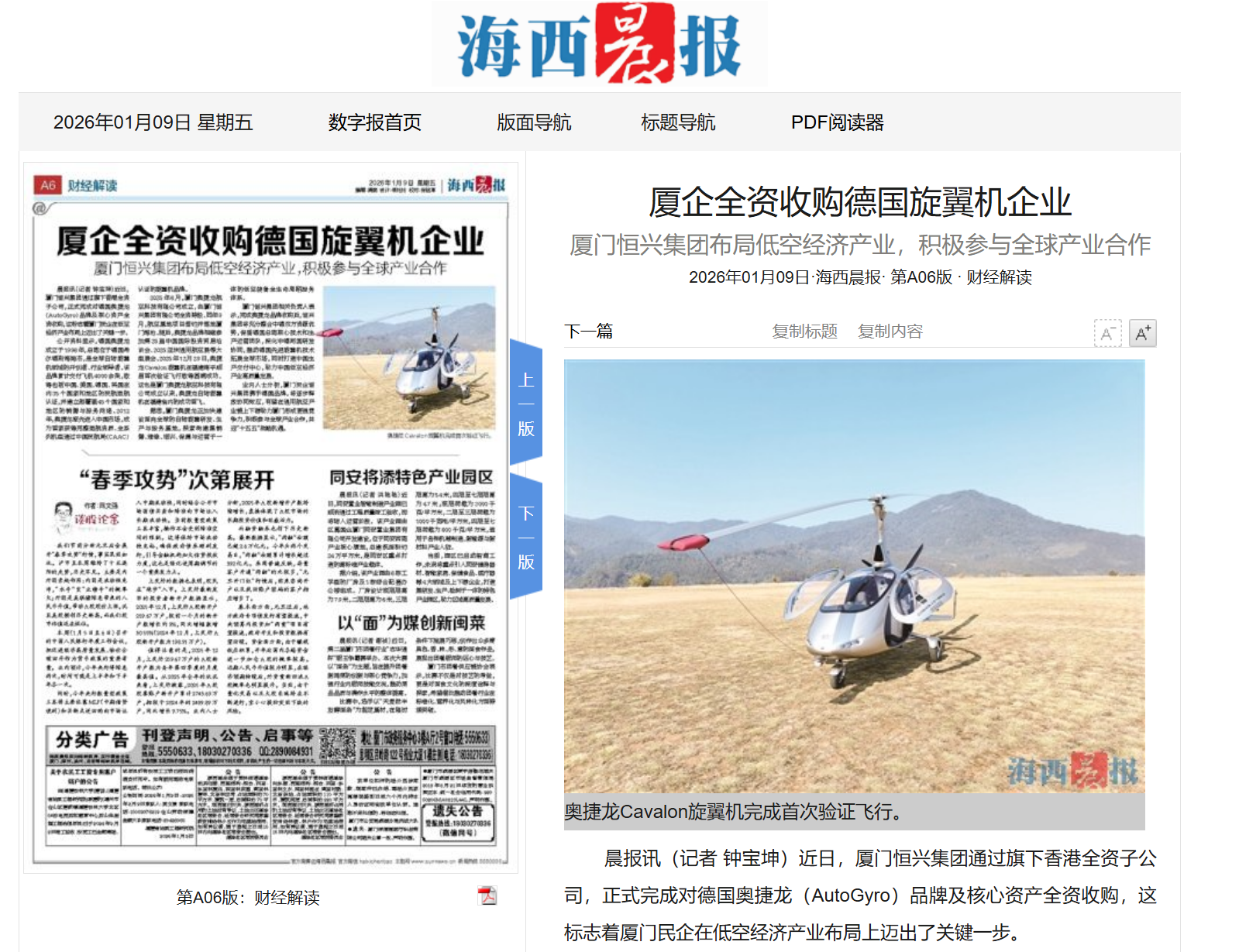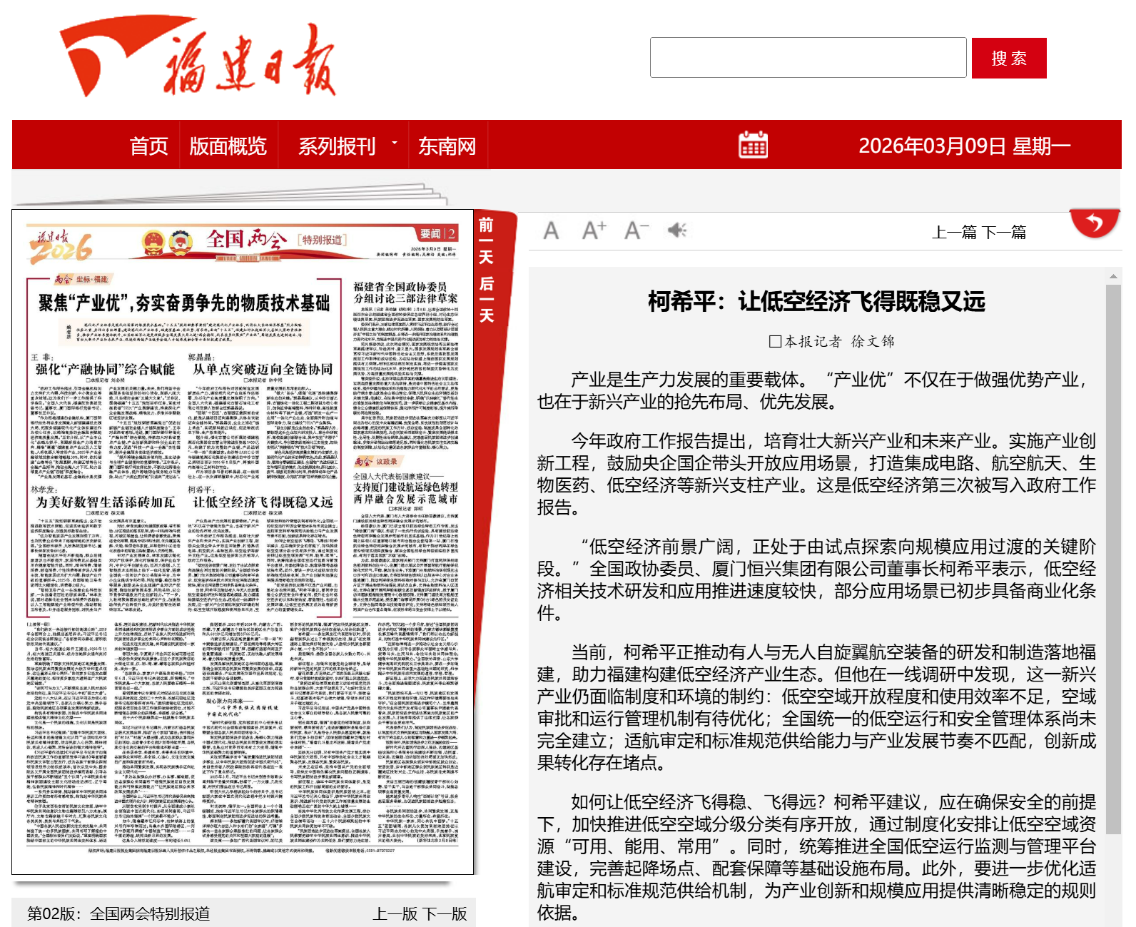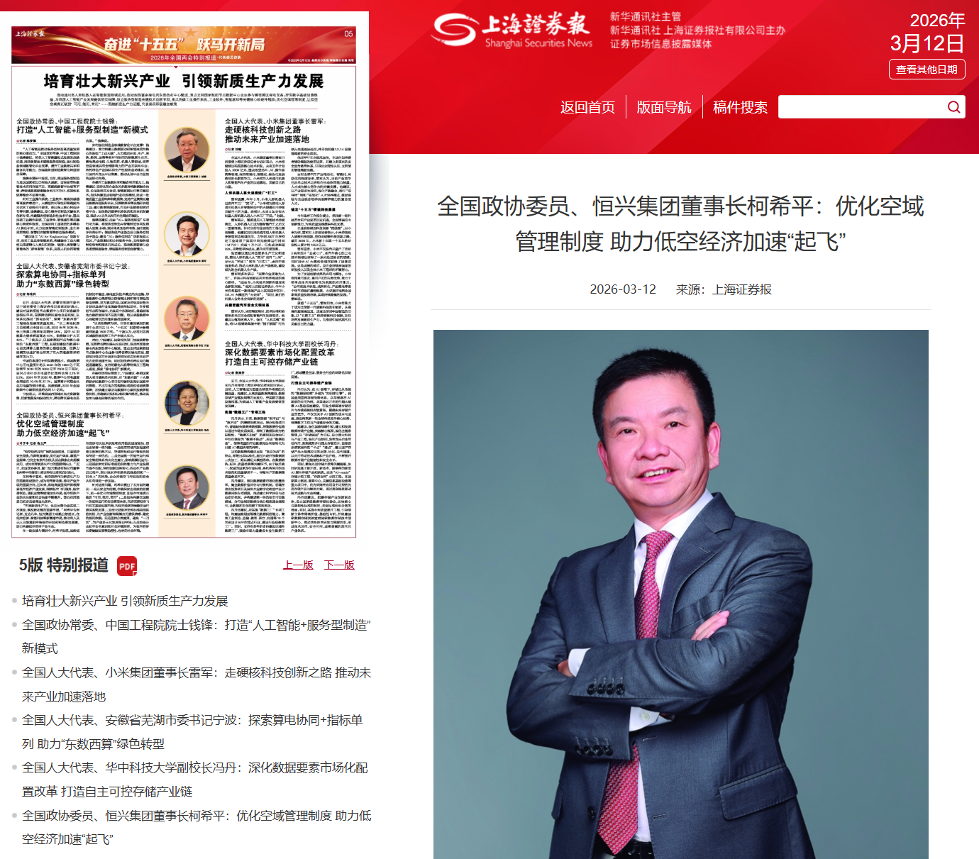【2026年3月12日《上海證券報》05版】“低空經濟具有廣闊的發展前景,只要堅持安全底線,完善制度建設,優化運行體系,尊重產業規律,它完全有條件加快從試點探索走向規模應用,成為培育新質生產力的重要增長點?!苯?,全國政協委員、廈門恒興集團有限公司董事長柯希平在接受上海證券報記者采訪時表示。在柯希平看來,低空經濟作為新質生產力的重要組成部分,成為培育新動能、推動產業升級的重要方向。近年來,各地高度重視并積極探索低空經濟產業發展,圍繞低空飛行服務、航空器制造、通航運營等領域加快布局,低空經濟產業的關注度和社會熱度不斷提升,部分應用場景已初步具備商業化條件。“布局新質生產力,也是民營企業實現二次創業、煥發新動能的重要舉措?!笨孪F礁嬖V記者,過去幾年,恒興集團主動跳出舒適區,在低空經濟、智能科技等新賽道布局,推動有人及無人自旋翼航空裝備的研發和制造落地福建,助力構建低空經濟產業生態。在一線實踐與